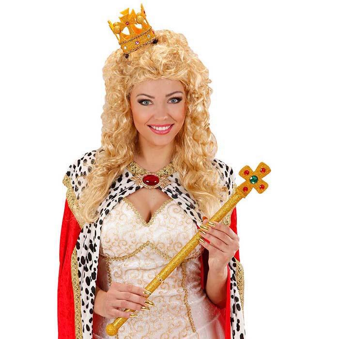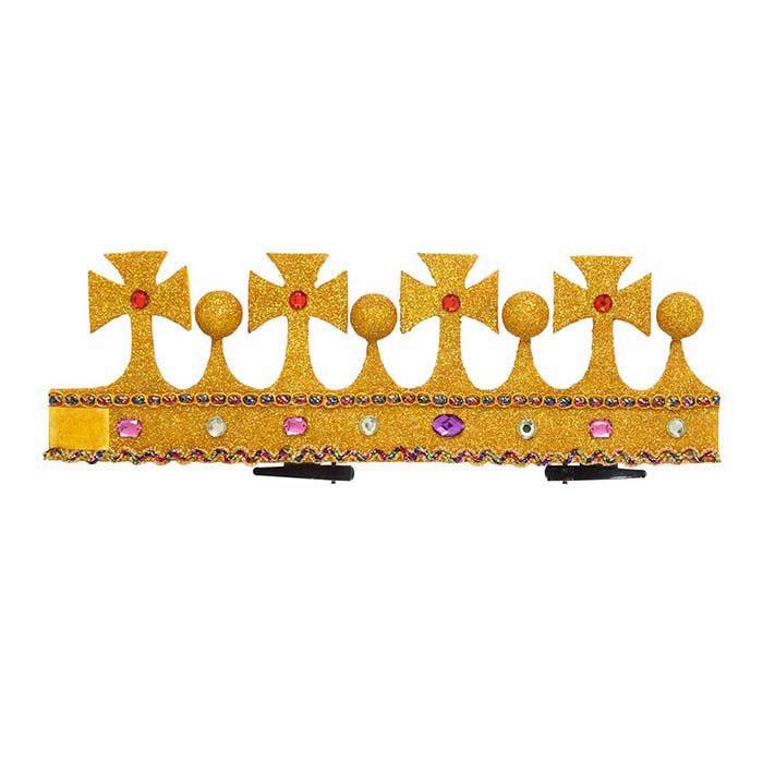 Diese Krone passt mit Sicherheit jedem, denn sie wird mit einem Klettverschluss geliefert und kann je nach Kopfumfang fest oder lockerer zugeklebt werden. Die Krone ist mit goldenem Glitzer und vielen bunten Steinen verziert. Sie sieht sehr edel aus und lässt sich super zu einem königlichen Kostüm kombinieren. Ein Hoch auf die Königin und den König!