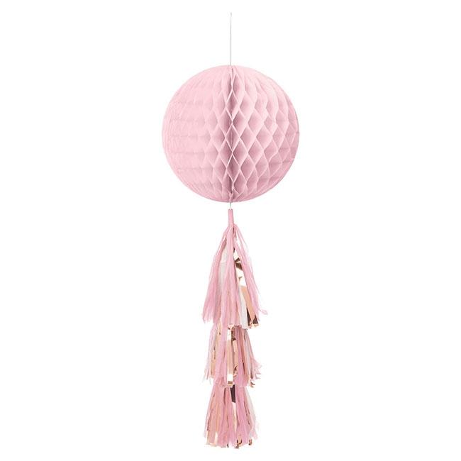 Der Wabenball der Serie "Rosige Party" hat eine Gesamthöhe von ca. 70 cm. Der Ball ist aus Seidenpapier gefertigt und ca. 30 cm im Durchmesser. Der Fransenschwanz ist aus Seidenpapier und metallischer Folie gefertigt und ca. 40 cm lang.