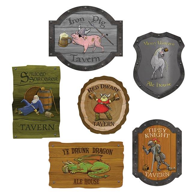 Die Wanddeko "Mittelalterliche Schilder" besteht aus beidseitig bedruckter Pappe. Die Schilder haben eine Größe von ca. 27,3 - 36 cm. Bitte beachten Sie, dass die sechs Schilder nicht selbstklebend sind. Wie der Name schon vermuten lässt, sind die Schilder im mittelalterlichen Stil gehalten und weisen auf die verschiedenen Tavernen oder Bierhäuser hin.