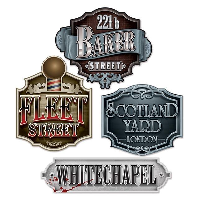 Die Wanddeko "Ort des Verbrechens" besteht aus einseitig bedruckter Pappe. Im Lieferumfang sind vier Schilder enthalten, deren Größen von ca. 29 - 46 cm variieren. Auf ihnen steht "Whitechapel", "221b Baker Street", "Scotland Yard London" oder "Fleet Street".