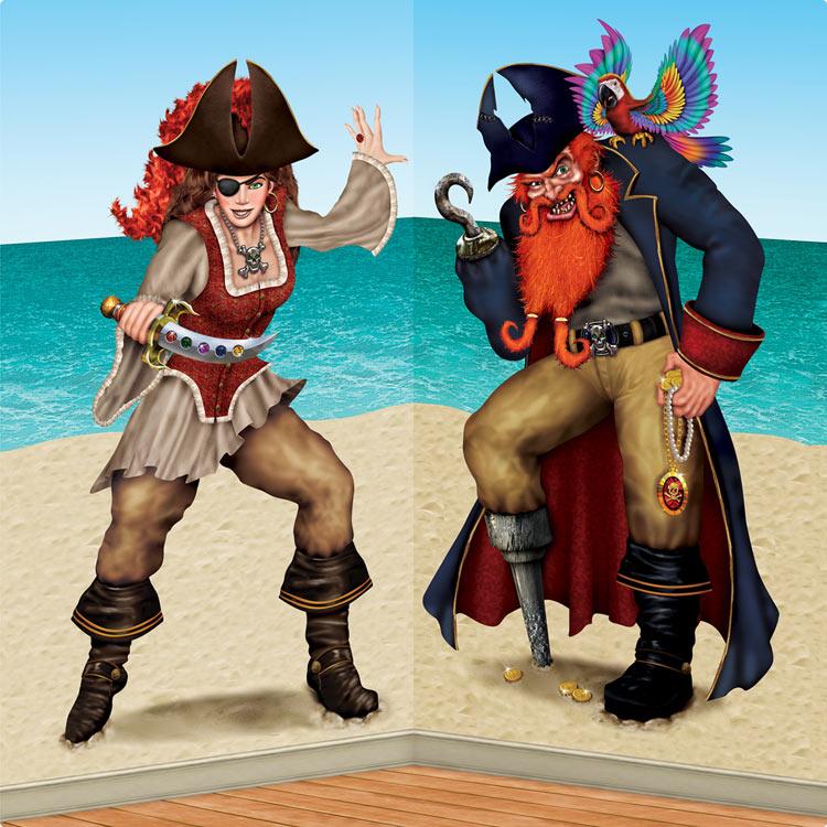 Lebensgroße Wanddeko für die Piratenparty! Die zwei transparenten Dekofolien sind einmal mit einer Säbel schwingenden Piratenbraut bedruckt, die ca. 157 cm groß ist. Die zweite Dekofolie zeigt einen grimmigen Piratenkapitän mit Holzbein, Piratenhaken und Papagei auf der Schulter. Diese Dekofolie hat eine Größe von ca. 169 cm. Beide Folien sind außerhalb des bedruckten Bereichs komplett transparent, sodass Sie die beiden Piraten auch auf verschiedenen Hintergrund-Dekos anbringen können.