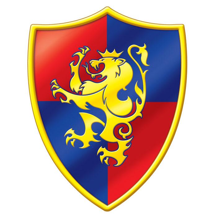 Edler Ritterwappen in der Größe 41 cm x 31 cm. Auf dem Pappwappen befinden sich vier Felder, zwei in rot und zwei in Blau, mit einer goldenen Linie umrandet. In der Mitte des Wappens befindet sich ein goldener Löwe. Da die Pappe beidseitig bedruckt ist, kann man sie auch ans Fenster hängen.