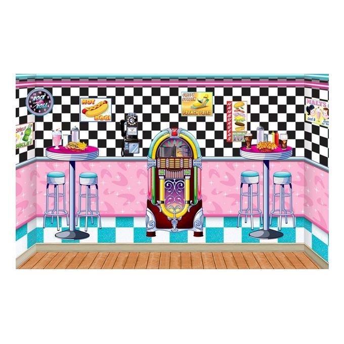 Typisch für die 50er Jahre sind die Pastell-Farben, die vielen American Diner und der Rock`n`Roll natürlich. Mit der Wanddeko Rock`n`Roll treffen Sie genau ins Schwarze! Durch die türkisen und weißen Karomuster und der darüber dargestellten Wand in pink-rosa haben Sie für Ihre Wand genau den richtigen Style gefunden. Ihre 50er Jahre Party kann nun perfekt starten!