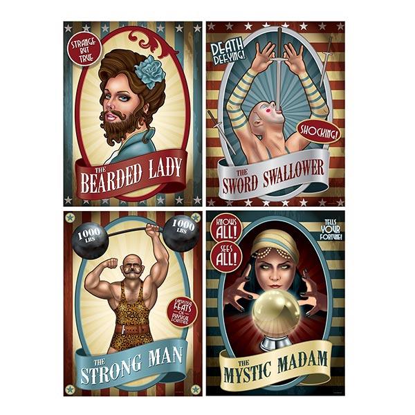 Die Wanddeko "Spektakuläre Zirkuswelt" ist 4-teilig und umfasst vier verschiedene Nostalgie-Motive vergangener Zirkustage. Ob Schwertschlucker, bärtige Frau, Wahrsagerin oder der stärkste Mann der Welt, hier bekommen Sie einiges geboten. Die nostalgischen Motive sind ca. 29 x 39 cm groß, und einseitig auf Pappe aufgedruckt.
