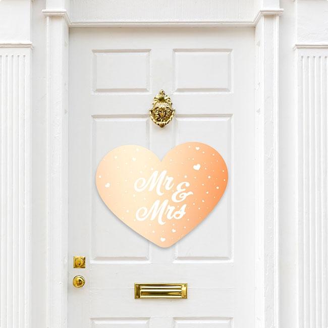 Bei der Wanddeko "Traumhochzeit" in Roségold" handelt es sich um ein ca. 56,5 x 46 cm großes Herz aus Pappe. Es ist einseitig in glänzendem Roségold, und weißen Herzen und Punkten, als auch dem weißen Schriftzug „Mr & Mrs“ bedruckt.