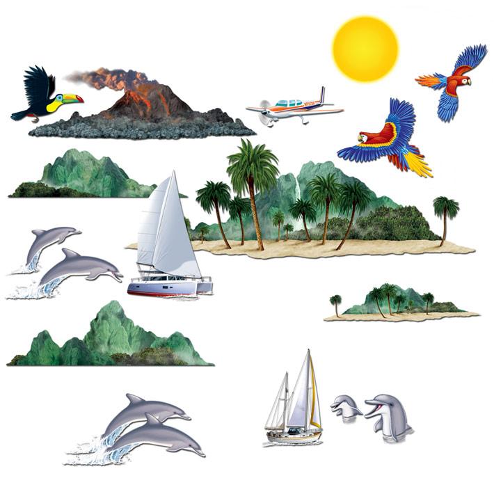 Die Wanddeko Tropische Reise macht aus Ihrer langweiligen Zimmerwand ein tropisches Paradies! Fühlen Sie sich wie auf einem luxuriösem Kreuzfahrtschiff, das die abgelegensten und schönsten Orte der Welt aufsucht! Delfine, blaues Meer, exotische Vögel und traumhafte Inseln - all das beinhaltet die Wanddeko Tropische Reise! Die 15 Motive sind zwischen 25 und 140 cm groß und zusammen auf einer großen transparenten Folie aufgedruckt. Die Motive sind nicht vorgeschnitten und müssen aus der transparenten Folie einzeln ausgeschnitten werden