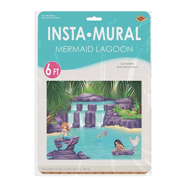 Die Wanddeko "Zauberhafte Nixe" kommt auf ein Maß von ca. 153 x 183 cm. Sie ist aus Kunststofffolie gefertigt und kann mit Heftzwecken oder Klebetapes befestigt werden. Abgebildet ist eine zauberhafte Lagune, auf der Meermädchen schwimmen.
