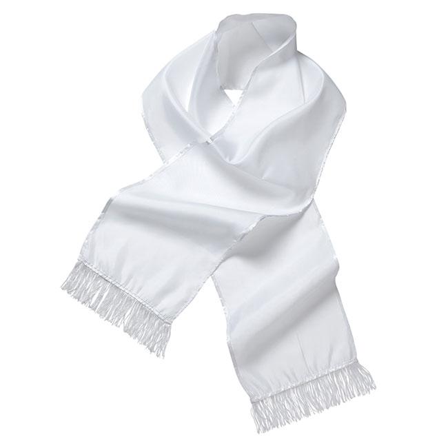 Der weiße Schal ist ca. 140 cm lang und trägt an beiden Enden weiße, weiche Fransen. Die gesamte Oberfläche des Schals ist glänzend.