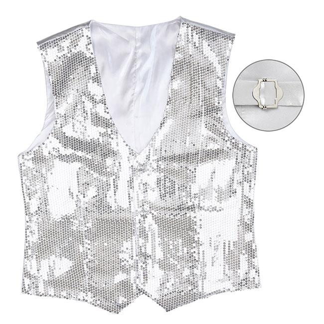 Diese Weste ist ein glitzernder Hingucker! Sie ist in den Größen L und XL erhältlich. Die Farbe Lila ist außerdem in der Größe M erhältlich. Das schicke Kleidungsstück ist in den Farben Silber, Gold, Rot, Schwarz, Pink und Lila erhältlich. Die Weste ist auf der Vorderseite mit Pailletten in der von Ihnen bestellten Farbe besetzt und wird mit Hilfe von Knöpfen geschlossen. Sie kann im Rückenbereich durch einen Verschluss gerafft werden.