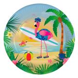 Die Wimpel-Girlande "Flamingo Party" ist ca. 10 m lang und besteht aus beidseitig bedruckter Kunststofffolie. Die insgesamt 15 Wimpel haben eine Größe von ca. 21,5 x 27 cm und sind abwechselnd mit einem Flamingo am Strand, sowie einer surfenden Krabbe bedruckt.