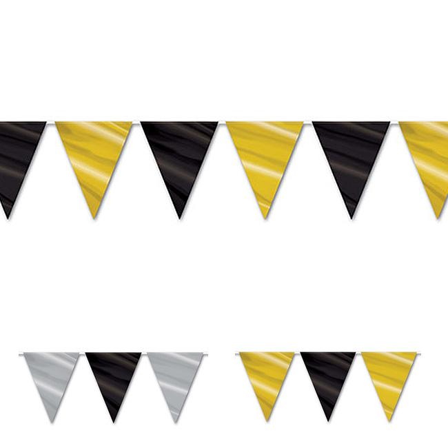 Die Wimpel-Girlande "Glamouröse Nacht" hat eine Gesamtlänge von ca. 3,7 m und besteht aus beidseitig bedruckter Kunststofffolie. Die einzelnen Wimpel haben eine Größe von ca. 22,5 x 28 cm und sind je nach Auswahl schwarz und gold oder schwarz und silber. Das Produkt wird mit einer Schnur zur Befestigung an der Wand geliefert.