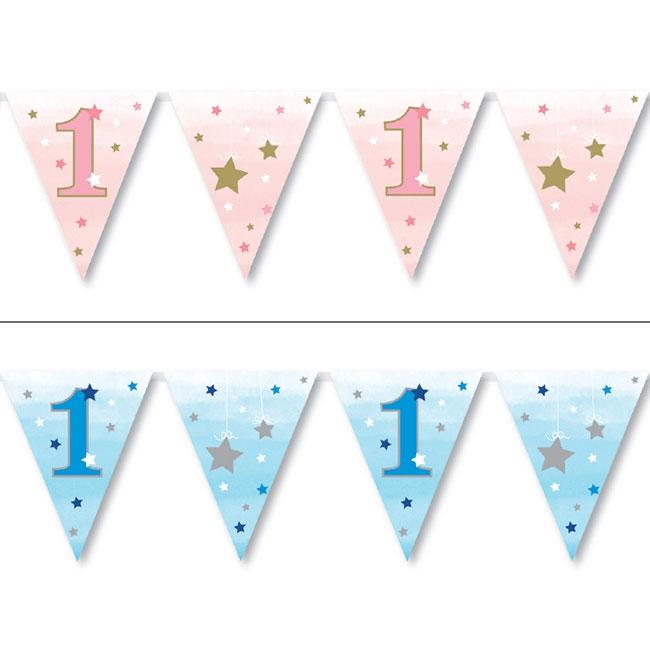 Die Wimpel-Girlande "Little Star" besteht aus einseitig bedrucktem Papier und ist ca. 3,7 m lang. Je nach Auswahl kann zwischen den Farben Rosa und Blau gewählt werden. Die Wimpel haben eine Höhe von ca. 28 cm und zeigen abwechselnd eine 1 oder viele kleine und größere Sterne.