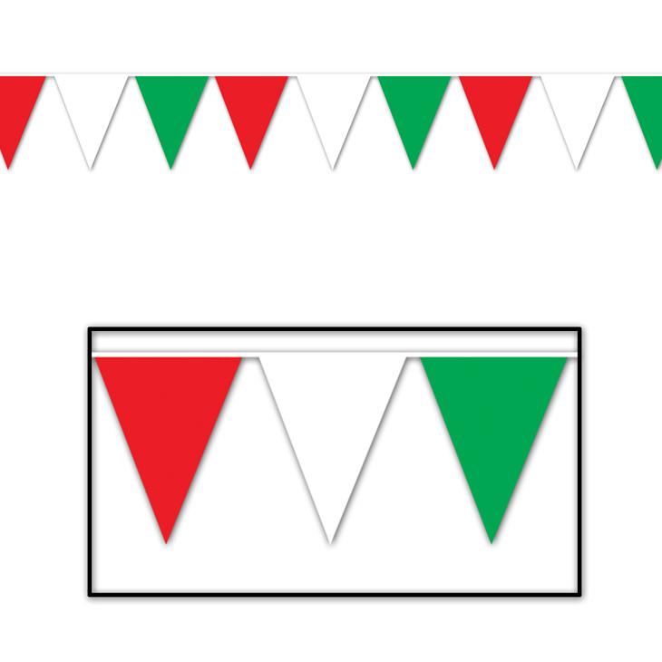 Mit den langen Wimpel-Girlanden verwandeln Sie jeden Raum in eine tolle Party-Location im Mexiko oder Italien-Stil. Die Wimpel-Girlande Mexiko Italien besteht aus aneinander gereihten Wimpeln in den National-Farben von Mexiko und Italien in grün, weiß und rot. Die komplette Girlande ist aus robustem, glattem Kunststoff gefertigt und kann so innen wie außen Ihre Party schmücken.
