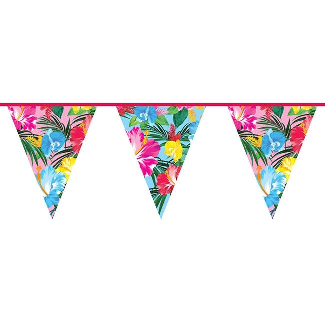 Die Wimpel-Girlande "Sommerlicher Blütentraum" ist ca. 10 m lang und besteht aus beidseitig bedruckter Kunststofffolie. Die fünfzehn Wimpel sind ca. 21,5 x 27 cm groß und zeigen diverse Blumen in verschiedenen Farben (z.B. Orchideen, Hibisken etc.).
