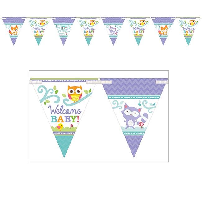 Die Wimpel-Girlande "Süße Waldbewohner" ist 25-tlg. und besteht aus 24 bedruckten Papp-Wimpeln und einem weißen Satinband. Die Wimpel sind unterschiedlich bedruckt. Zum einen mit kleinen Eulen und dem Schriftzug "Welcome Baby" oder mit anderen süßen Waldbewohnern wie Waschbären und Füchsen. Die Girlande muss selbst aufgefädelt werden. Jeder Wimpel ist ca. 18 cm hoch und ca. 15 cm breit.