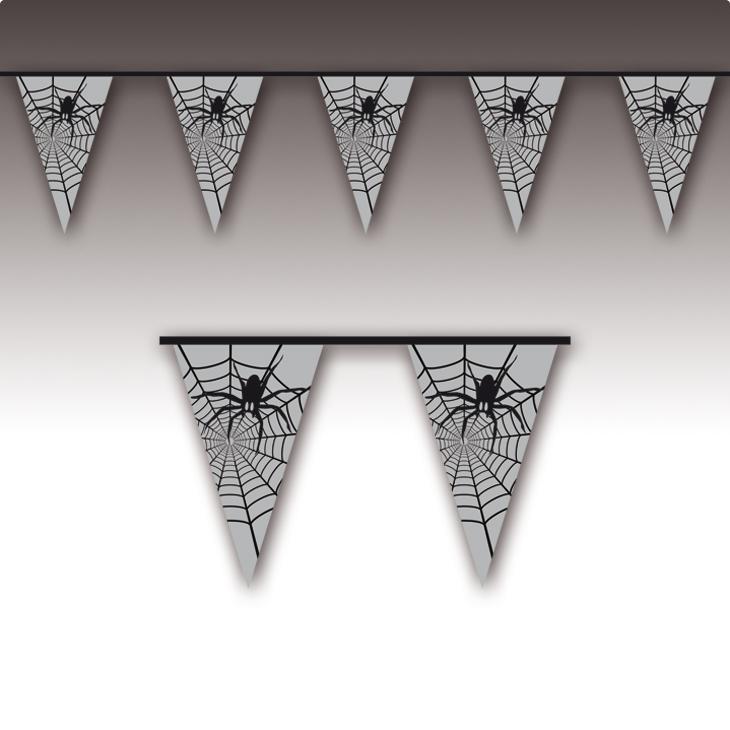 Mehr Info: Die Wimpelgirlande Spinne ist ca. 6 m lang. Jeder Wimpel ist aus Kunststoff gefertigt und ist etwa 30 cm groß.