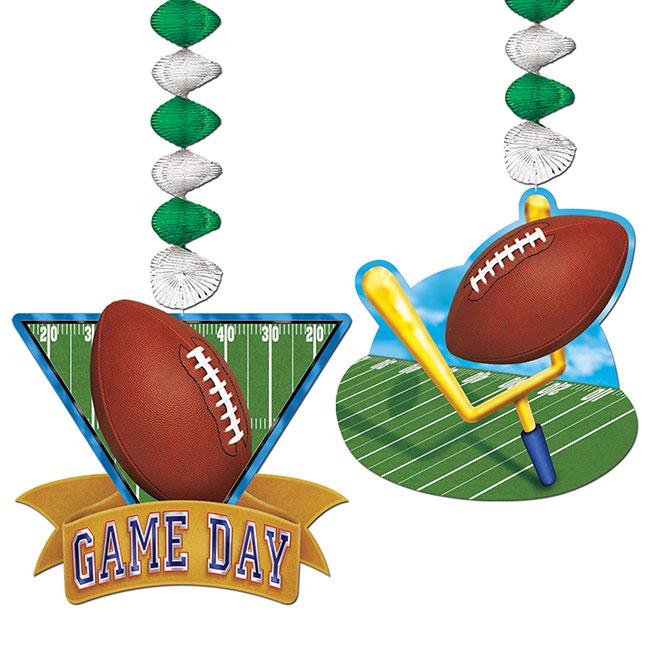 Die Wirbel-Deckenhänger "American Football" bestehen aus beidseitig bedruckter Pappe und metallischer Folie. Im Lieferumfang sind je zwei Deckenhänger mit unterschiedlichen Motiven enthalten, die eine Länge von ca. 76 cm haben. Das Produkt wird mit einer Schnur zur Befestigung an der Wand geliefert.