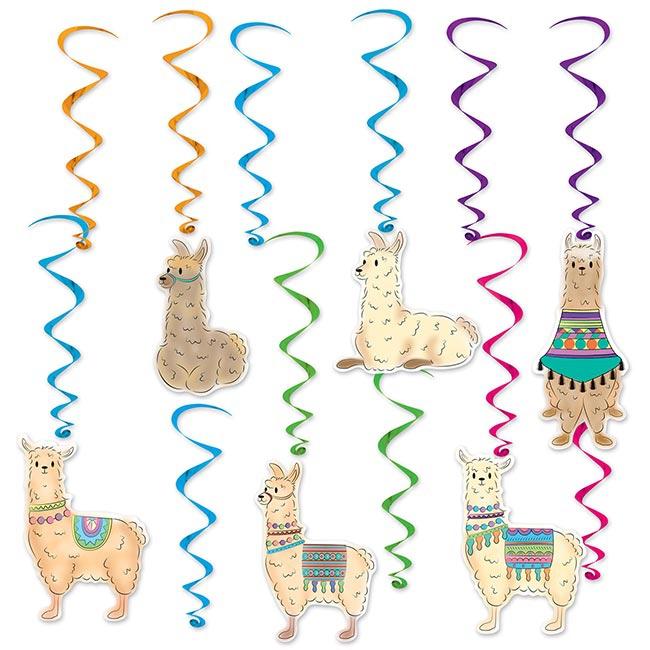 Die Wirbel-Deckenhänger "Reise nach Peru" bestehen aus beidseitig bedruckter Pappe und metallischer Folie. Als Motiv hängen an manchen Wirbeln niedliche Lamas. Insgesamt sind zwölf Wirbel-Deckenhänger im Lieferumfang enthalten. Sie haben eine Länge von ca. 44 - 81 cm. Außerdem werden die Deckenhänger mit Nylonhaken geliefert, sodass Sie sie ganz einfach an einer Decke befestigen können.