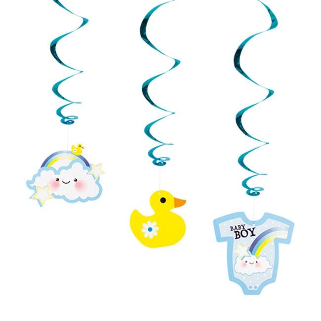 Das Wirbel-Deckenhänger-Set "Schnulleralarm" umfasst insgesamt drei Hänger mit einer Länge von ca. 60 cm. Die Deckenhänger bestehen aus metallischer Folie, der Motivanhänger ist aus beidseitig bedruckter Pappe. Es kann zwischen den Farben Blau und Rosa gewählt werden. Bei den Motiven handelt es sich um eine Badeente, eine lachende Wolke und einen Babystrampler. Die Größe der Anhänger Variiert zwischen ca. 11,5 x 11 cm (Badeente) bis ca. 13 x 10 cm (Wolke).