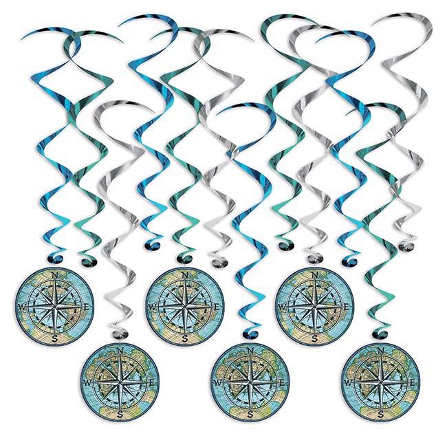 Die Wirbel-Deckenhänger Bon Voyage bestehen aus insgesamt 12 metallischen Wirbel-Deckenhängern aus silberner, türkiser und blauer metallicher Folie. Bei sechs der Wirbel befindet sich am Ende jeweils ein Anhänger mit einem nautischen Kompass. Diese sind aus Pappe und beidseitig bedruckt.