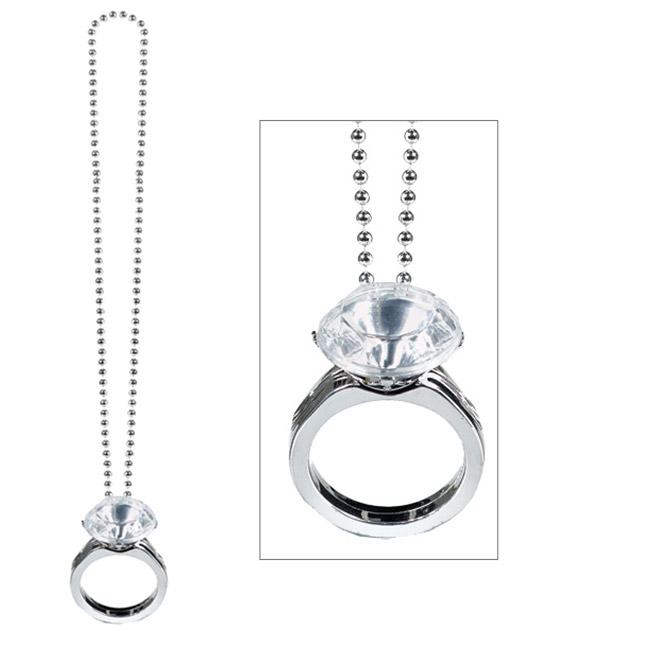 Mit dem XL Diamant-Ring "Bride to be" an der Kette kann Frau ganz schön protzen. Der Kunststoffring in insgesamt ca. 10 cm hoch und hat einen Durchmesser von ca. 7,5 cm. Der Diamant hat einen Durchmesser von ca. 5,5 cm. Kette sowie Ring sind in silber gehalten.