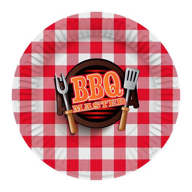 Die XL-Pappteller "Meisterliches BBQ" haben einen stolzen Durchmesser von ca. 27 cm und werden im 8er Pack geliefert. Sie sind einseitig mit rotweißem Karo im Tischdecken-Look, sowie einem Grill, Grillbesteck und dem Satz „BBQ Master“ bedruckt. Zeigen Sie was für ein Grillmeister in Ihnen steckt.