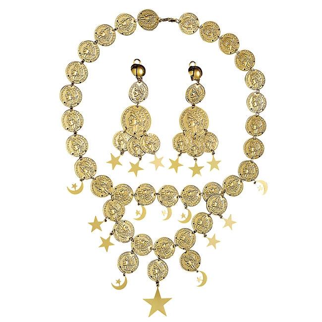 Dieses Schmuckset enthält eine Kette und ein Paar Ohrringe. Die Kette besteht aus aneinander gereihten Münzen aus dünnem Metall in goldener Farbe. An der Stelle des Kettenanhängers befindet sich ein Muster aus Münzen mit Plättchen aus Sternen und Halbmonden. Die Kette klimpert und glänzt. Die Ohrringe mit Clips haben denselben Anhänger aus Münzen mit Sternen und sind ca. 7 cm lang. Alles besteht aus dünnem goldfarbenem Metall.