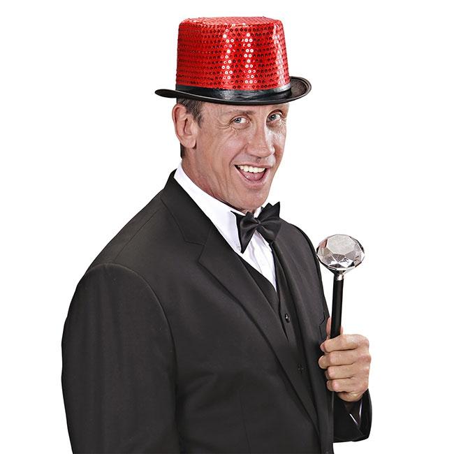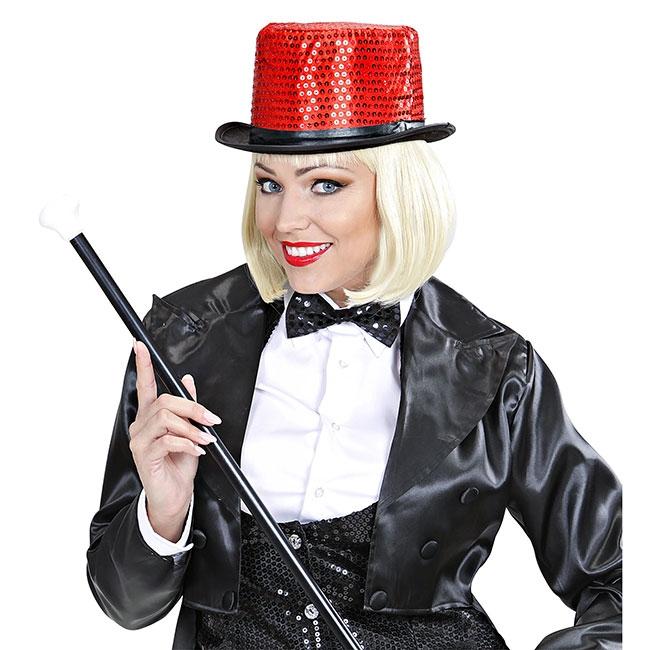Dieser Hut hat die klassische Zylinderhut-Form und ist mit Pailletten bestickt. Er ist in den Farben: gold, silber, schwarz oder rot erhältlich, wobei die Hutkrempe immer schwarz bleibt. Er ist nur in Einheitsgröße verfügbar.